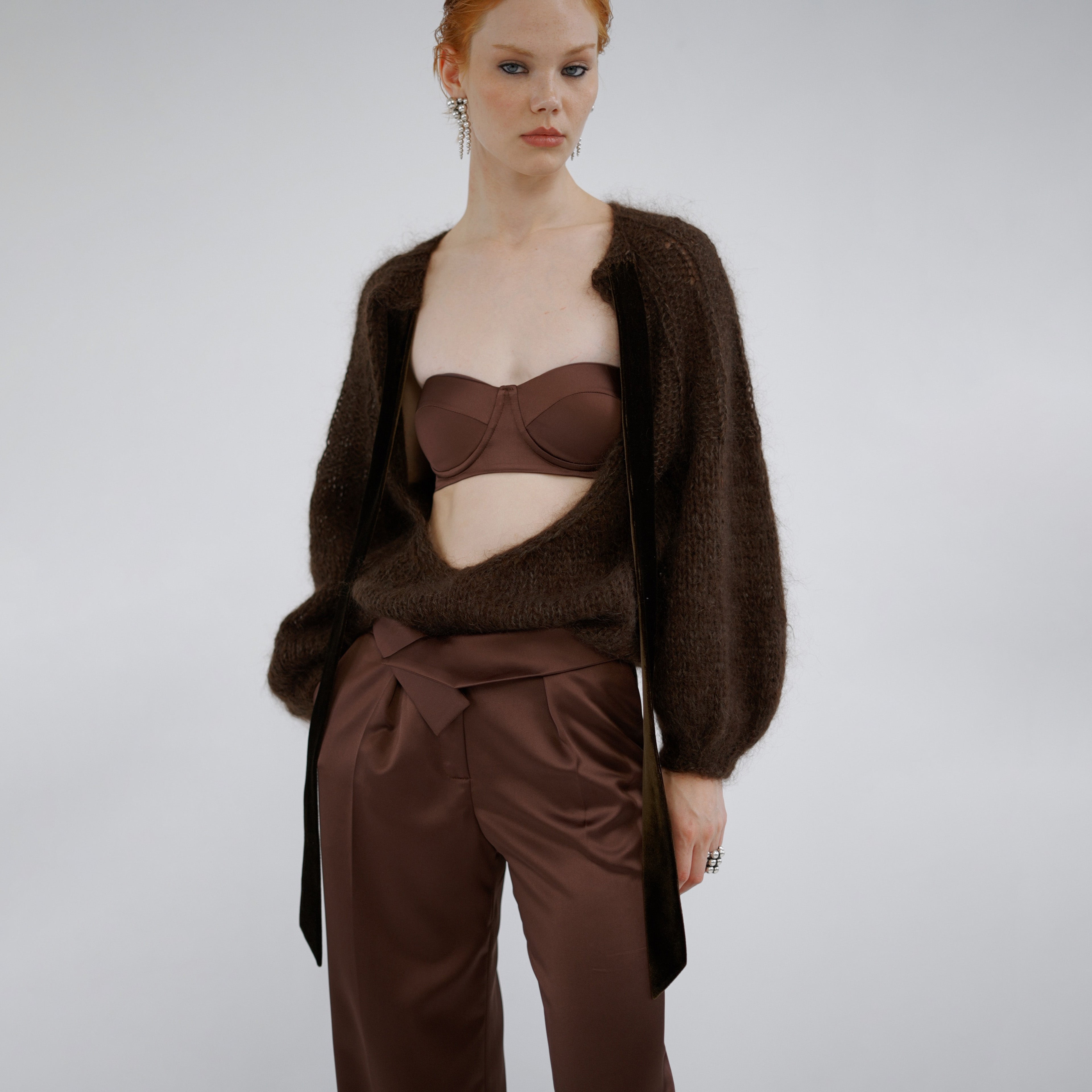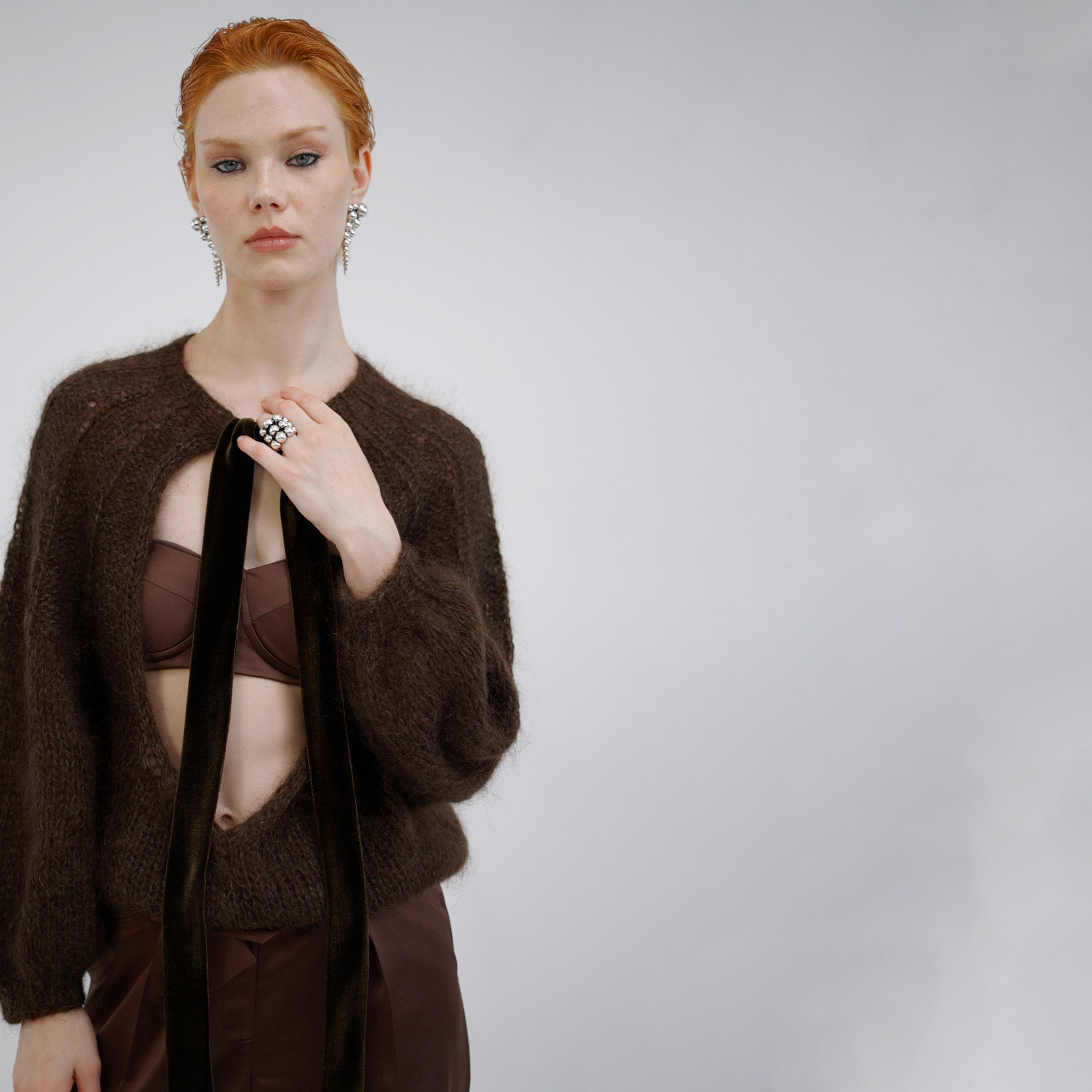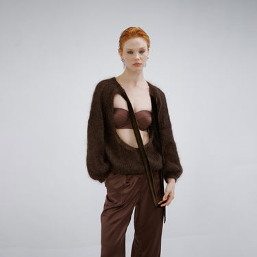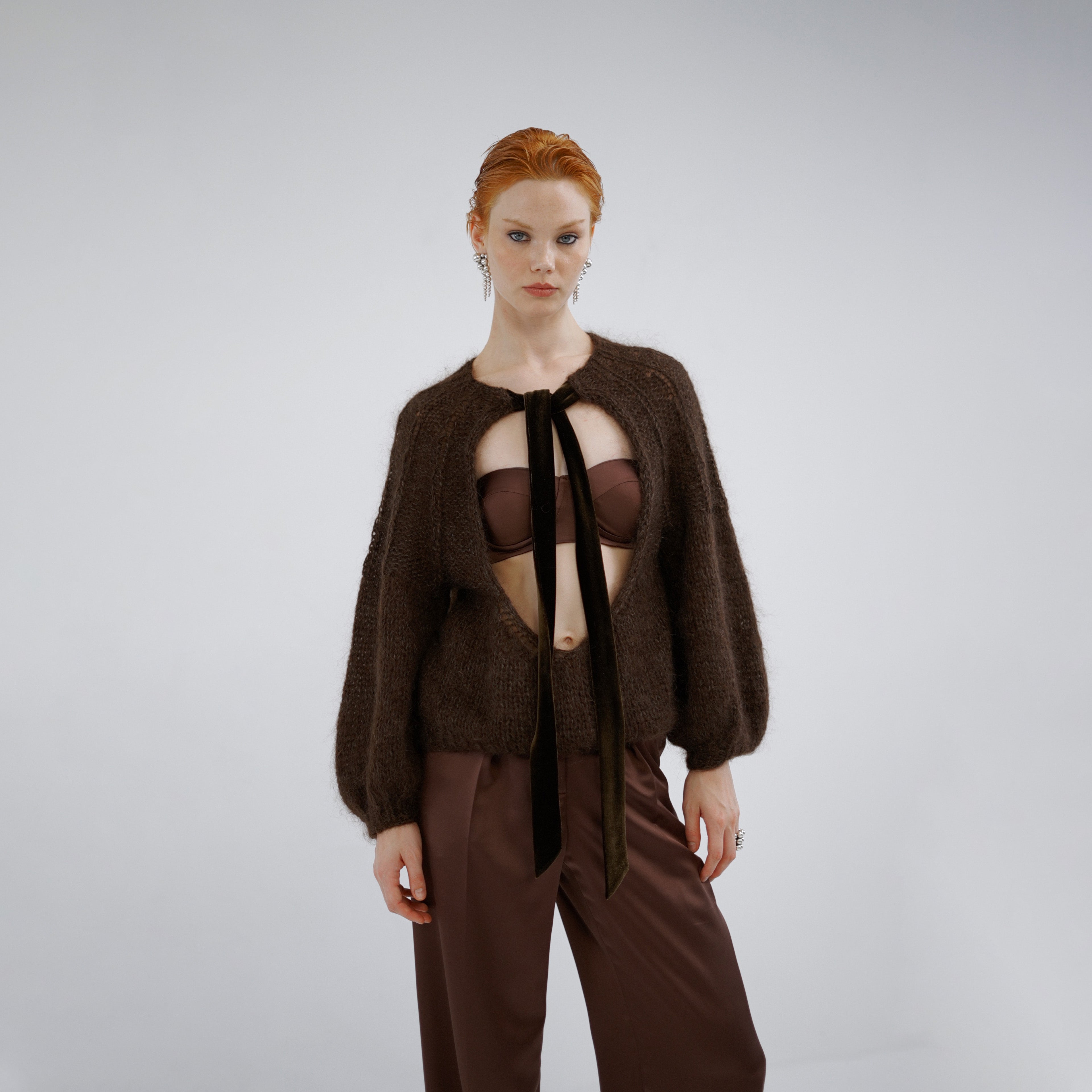 In rich chocolate brown, the COQUETTE SWEATER CHOCOLATE channels warmth, depth, and quiet drama. This seamless hand-knitted piece features a flattering round yoke and a sensual open back tied with a plush velvet ribbon. The crocheted cast-off detail frames the hem with perfection, offering a clean finish that reflects artisanal excellence.