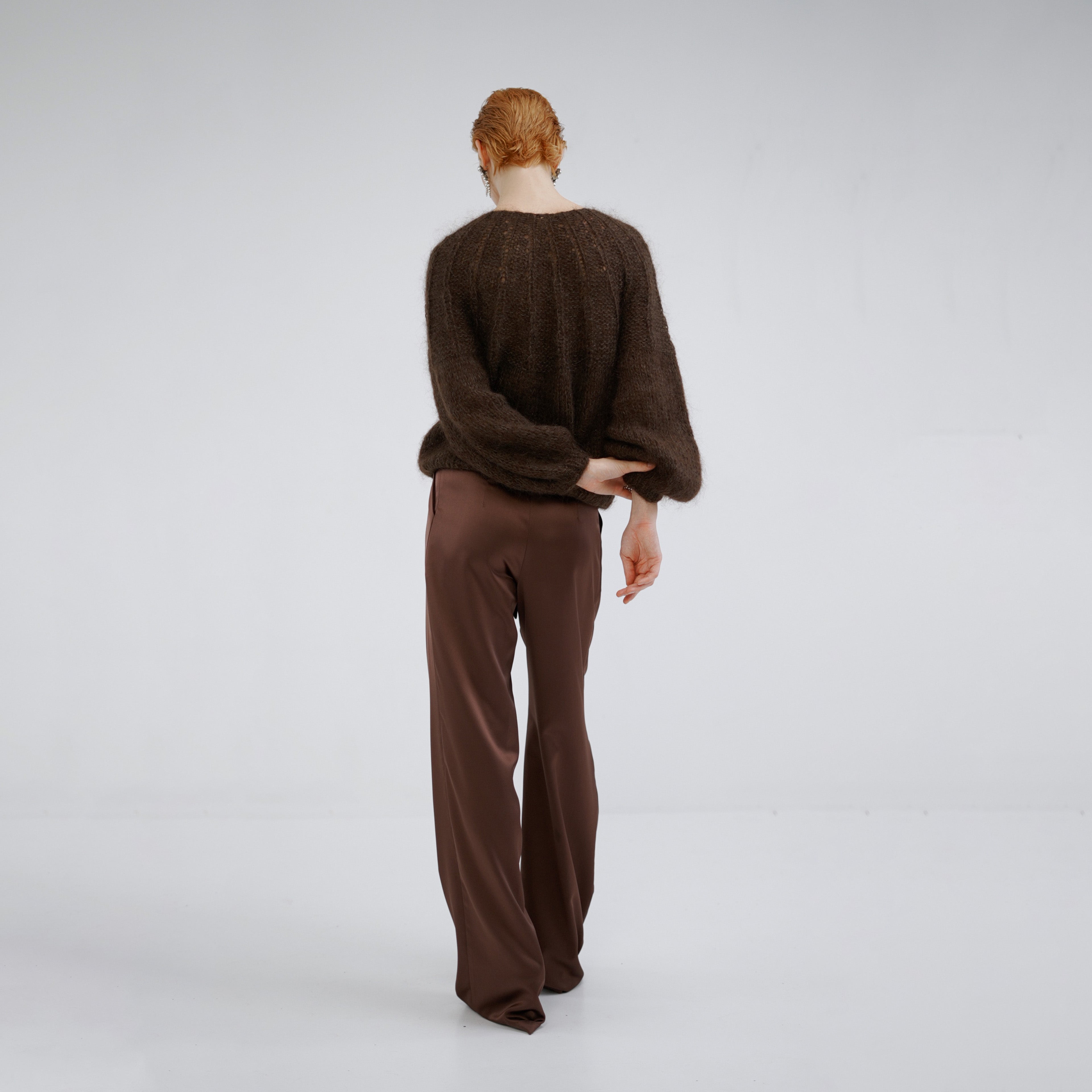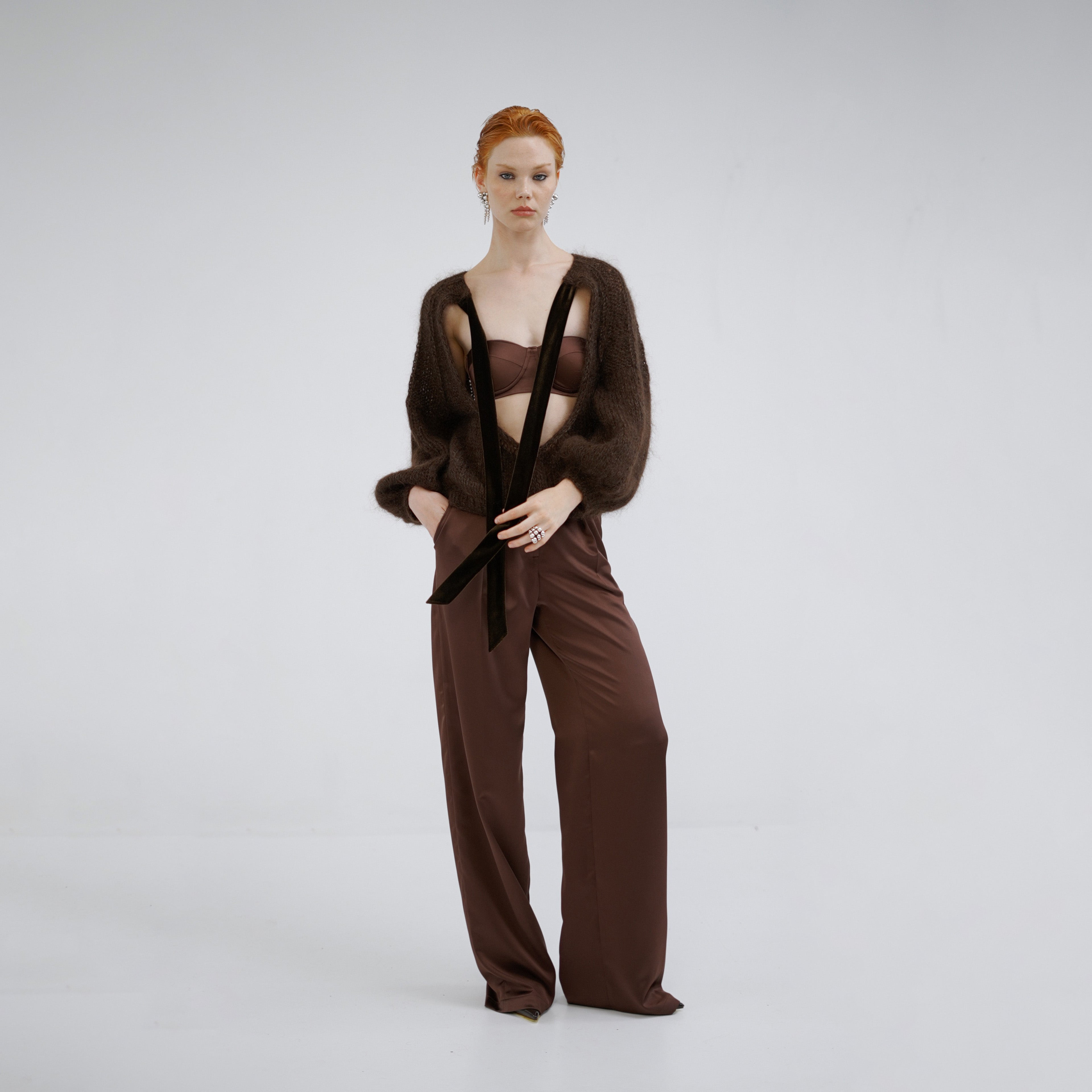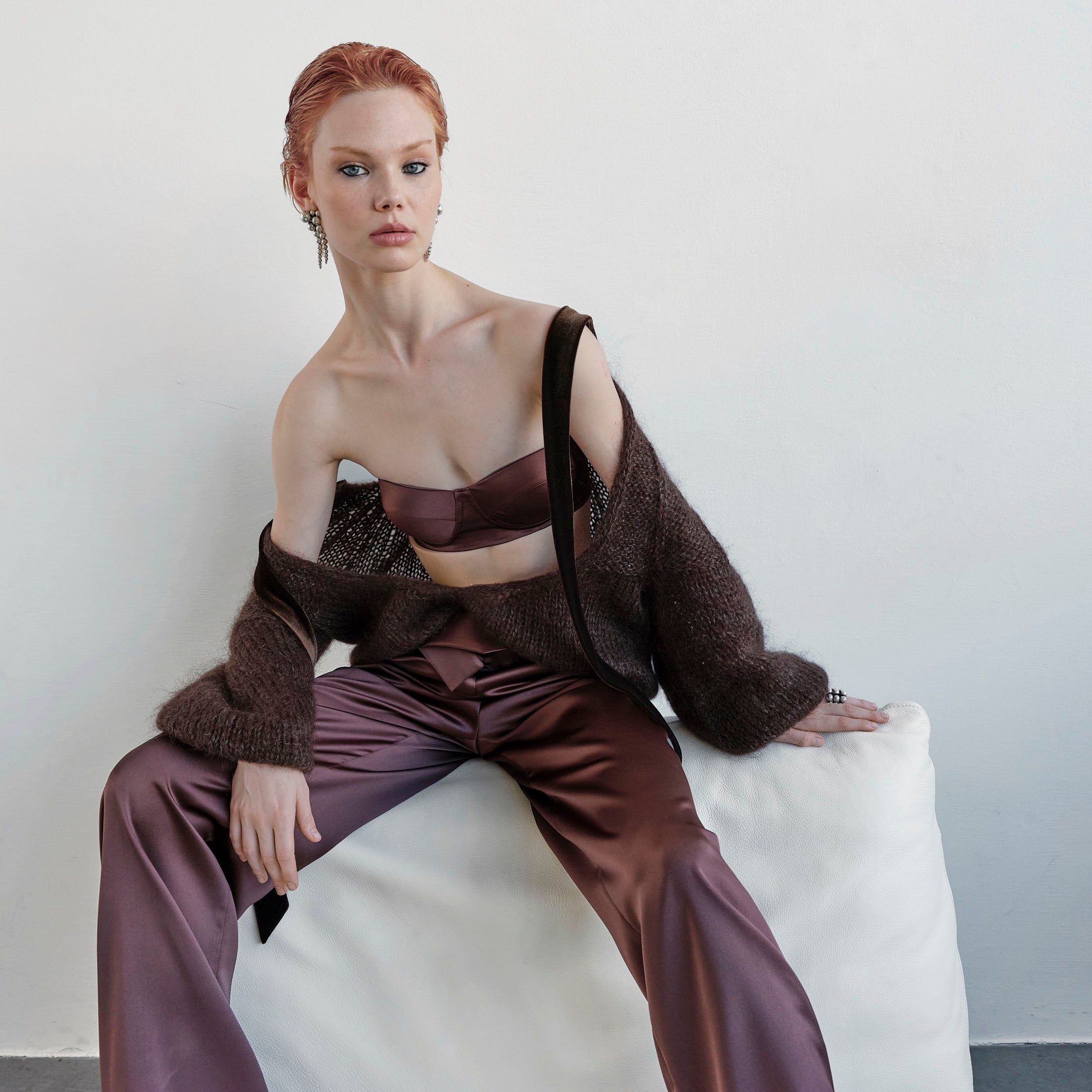 In rich chocolate brown, the COQUETTE SWEATER CHOCOLATE channels warmth, depth, and quiet drama. This seamless hand-knitted piece features a flattering round yoke and a sensual open back tied with a plush velvet ribbon. The crocheted cast-off detail frames the hem with perfection, offering a clean finish that reflects artisanal excellence.