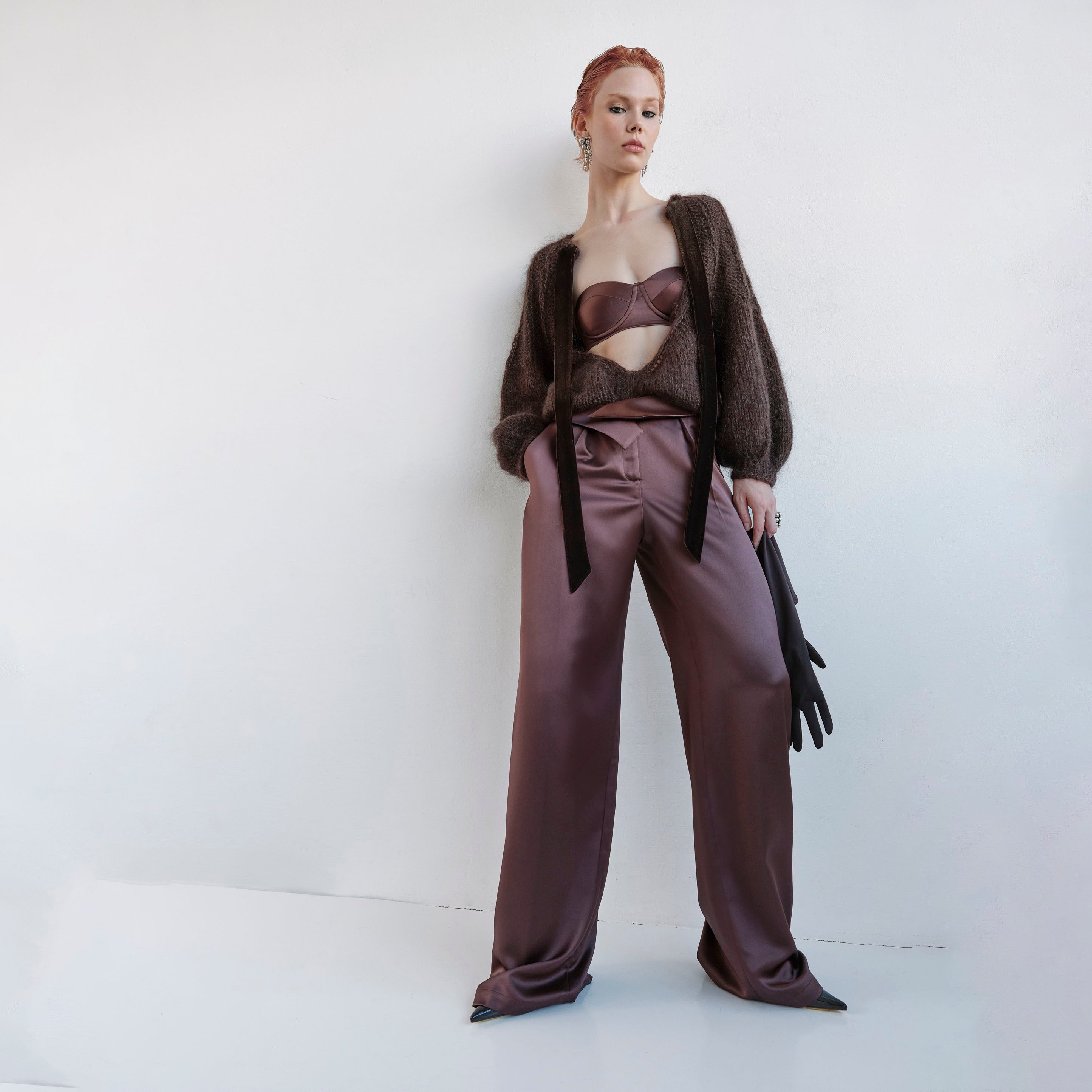 Style with vintage trousers, velvet shorts, or a structured midi skirt. Accessorize with oversized earrings and ankle boots to create balance between softness and strength.