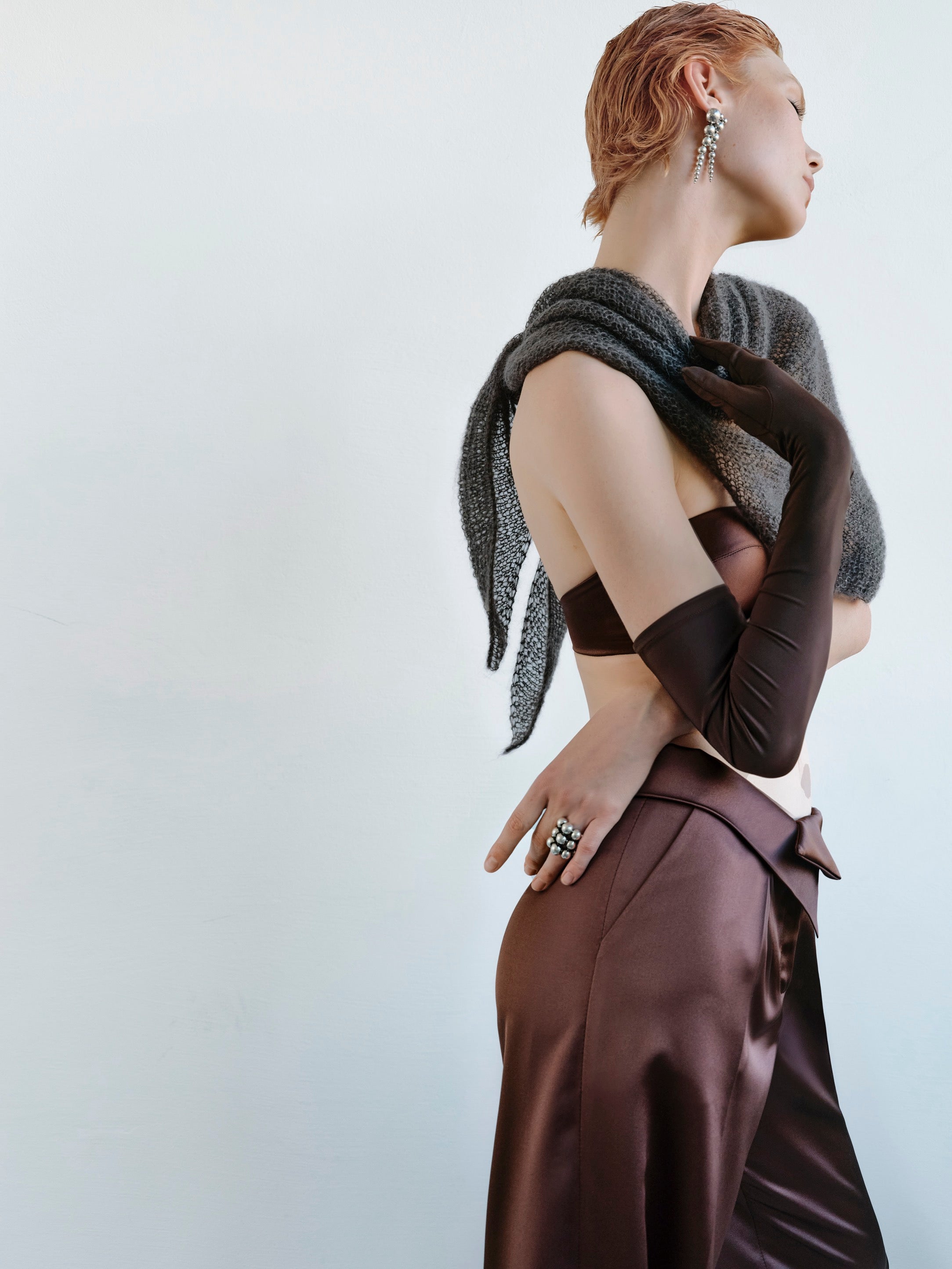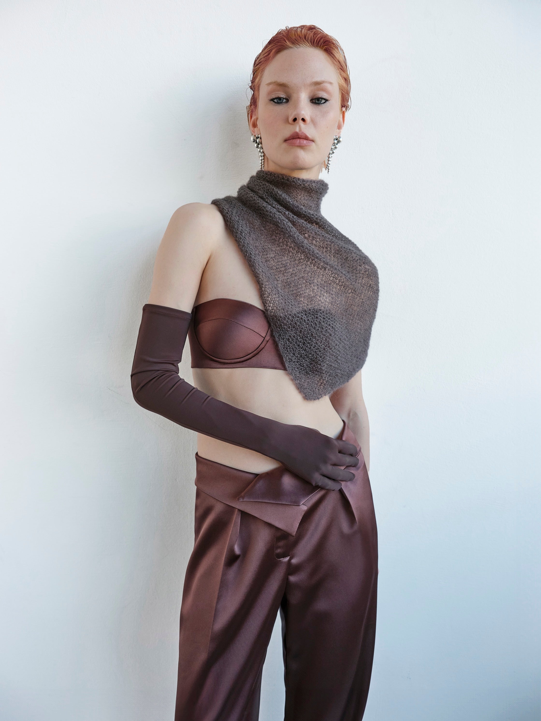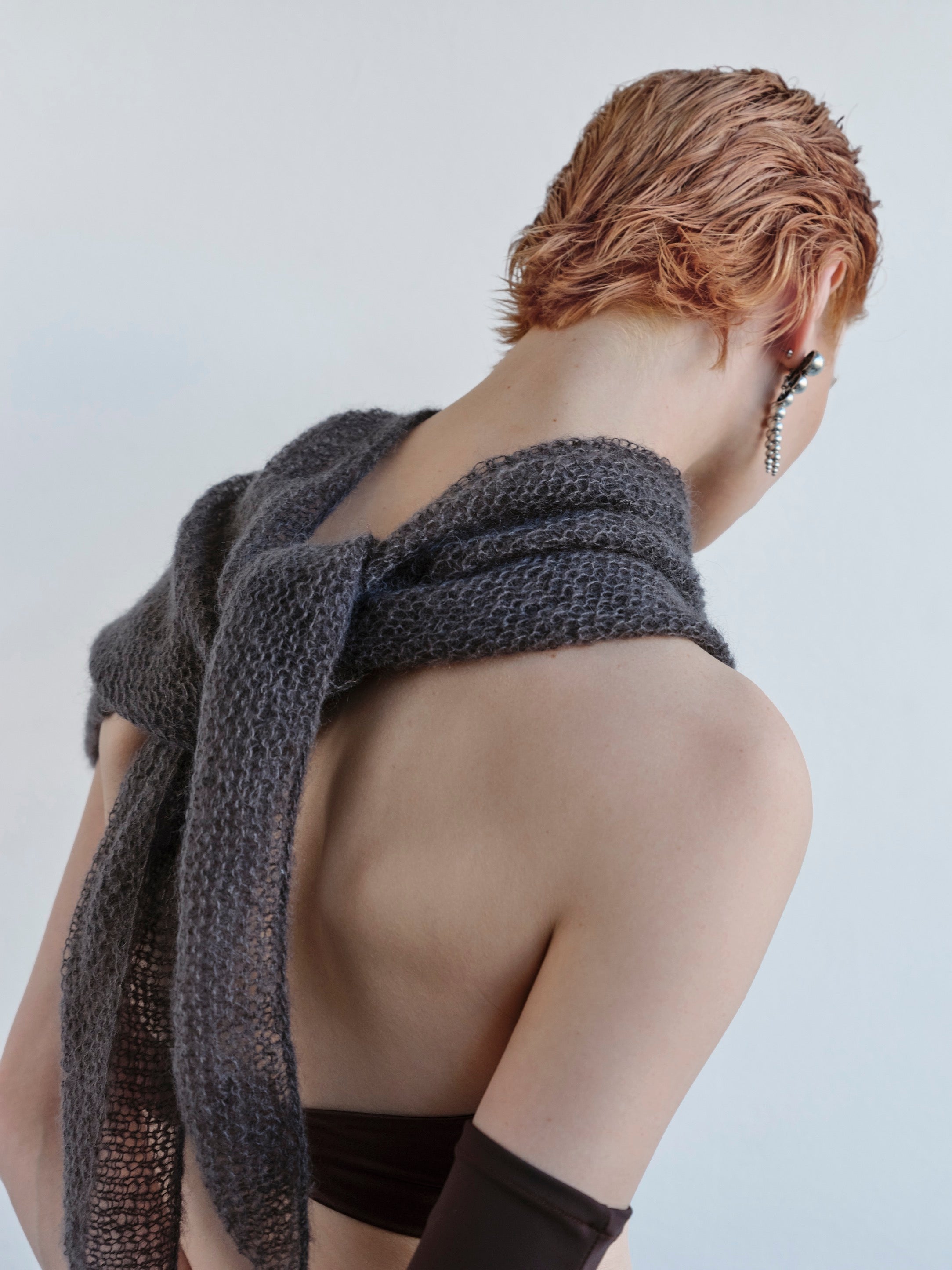 The CHERIE SHAWL in timeless grey is hand-knitted in a garter-stitch technique that creates a soft, airy, and structured fabric with signature textured rows. Crafted as a seamless square, it drapes fluidly, offering versatile styling options — from a sculptural wrap to a neckerchief or shoulder accessory. The construction elevates the natural qualities of mohair: supreme lightness, insulation, and a semi-sheer couture finish.
