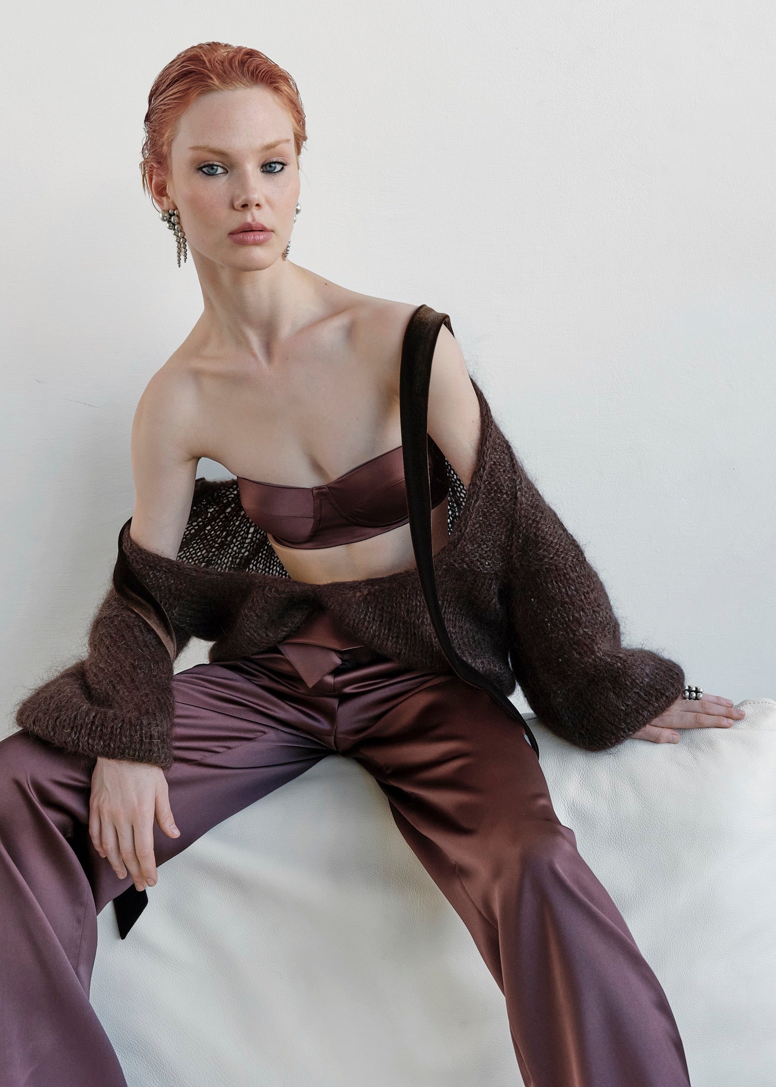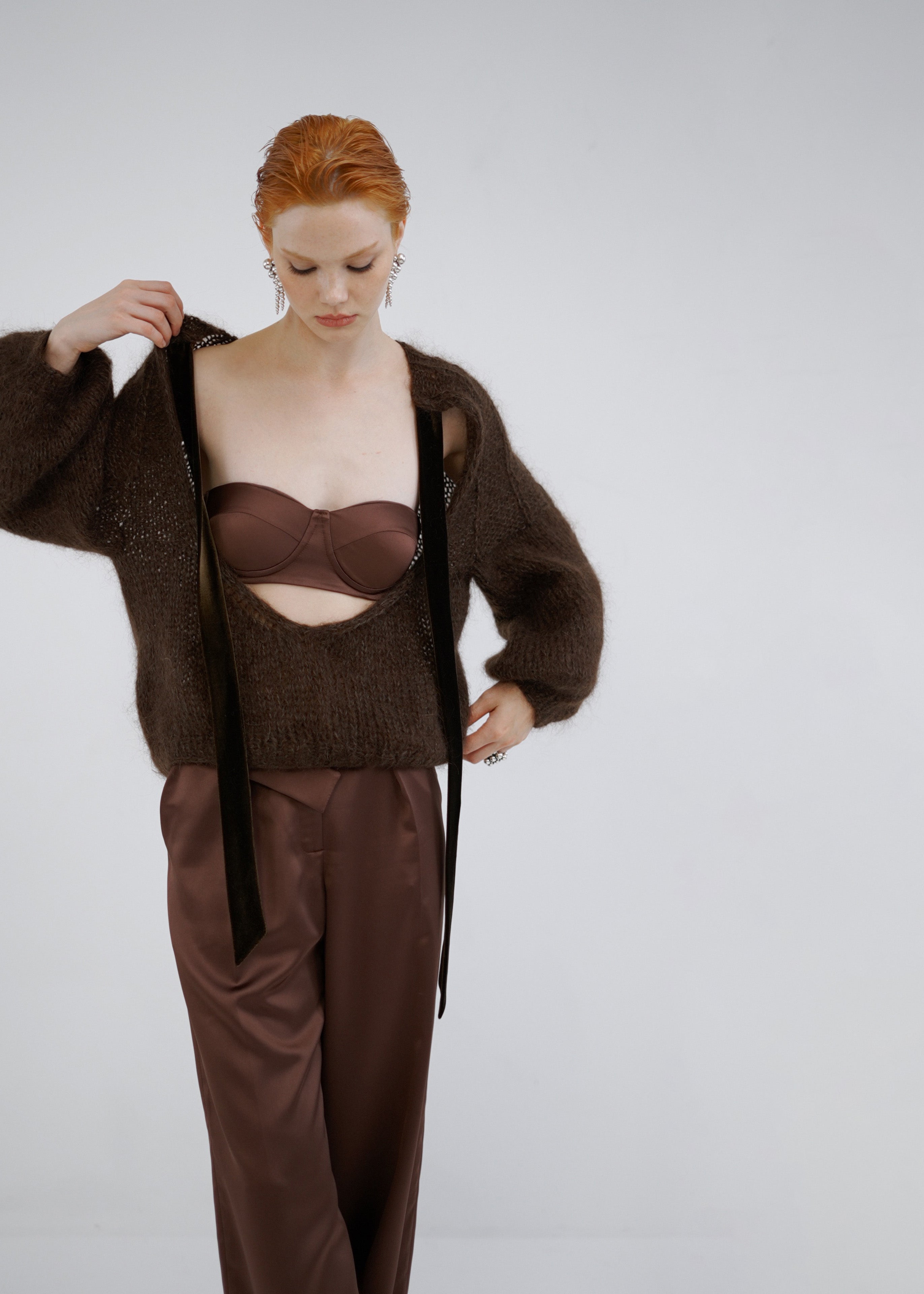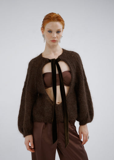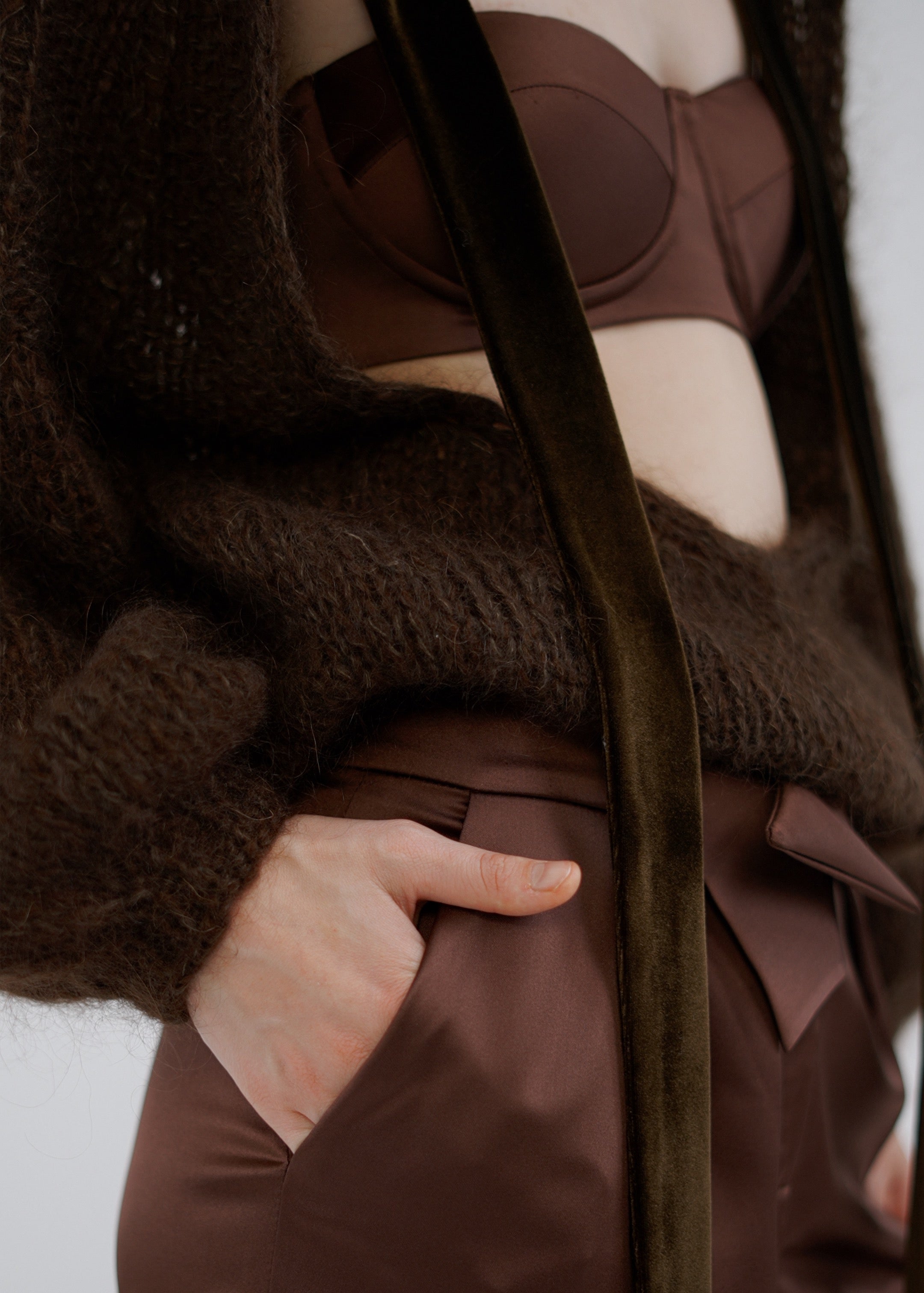 In rich chocolate brown, the COQUETTE SWEATER CHOCOLATE channels warmth, depth, and quiet drama. This seamless hand-knitted piece features a flattering round yoke and a sensual open back tied with a plush velvet ribbon. The crocheted cast-off detail frames the hem with perfection, offering a clean finish that reflects artisanal excellence.